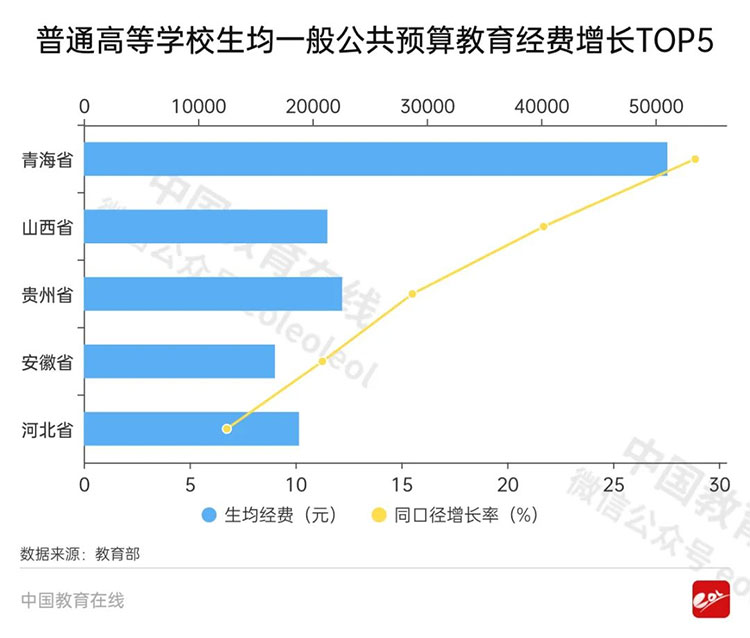 普通高校階段,大學(xué)生生均經(jīng)費為22586.42元,同口徑比上年增長1.65%。增長最快的是青海省(28.88%)。其次為山西省(21.72%)、貴州省(15.52%)、安徽省(11.27%)、河北省(6.76%)。