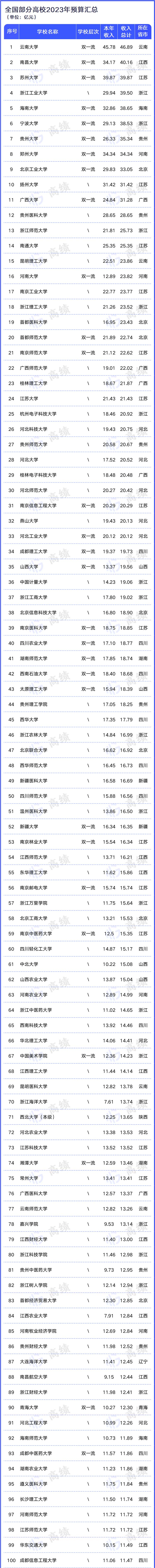 全國部分高校2023年預算經(jīng)費匯總?cè)缦卤?,因篇幅限制,本文僅呈現(xiàn)其中200所高校。