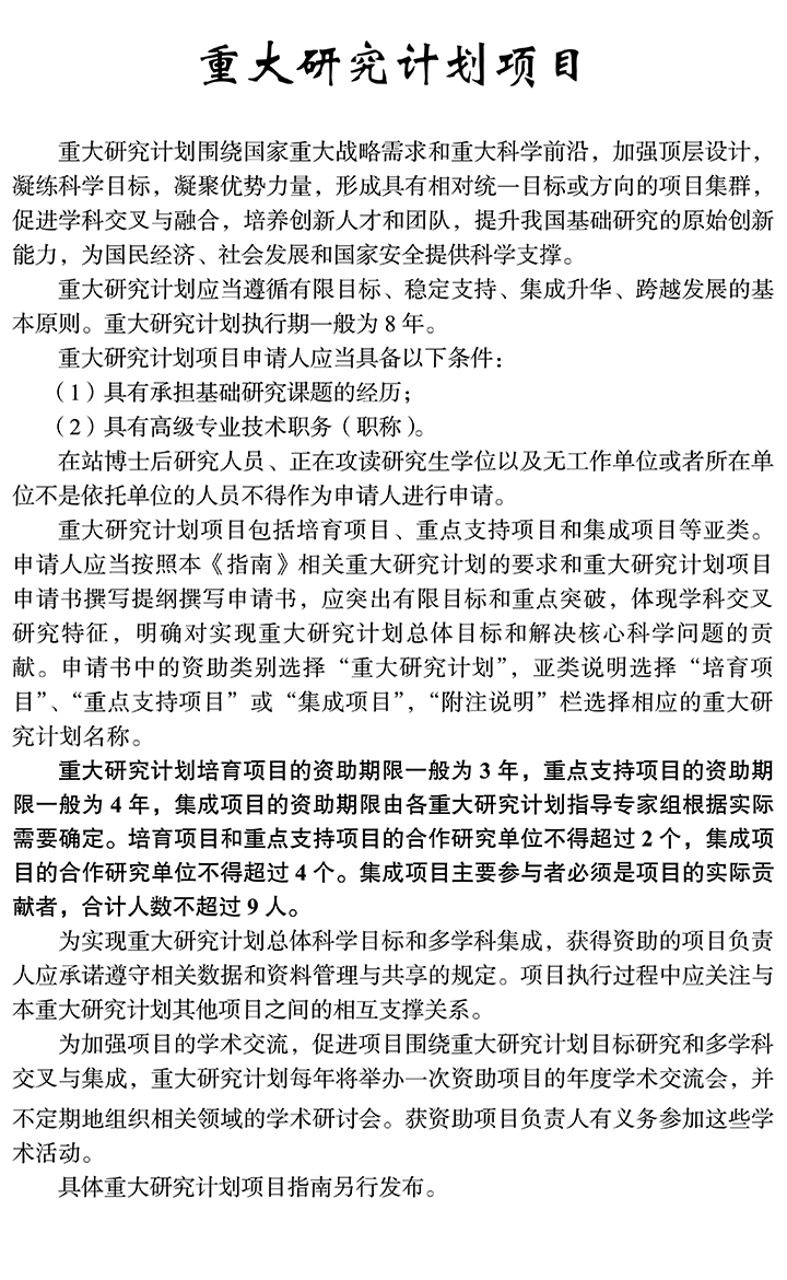 國(guó)家重大科研儀器研制項(xiàng)目(部門推薦)負(fù)責(zé)人在自然科學(xué)基金委做出資助決定之后至準(zhǔn)予結(jié)題前不得作為申請(qǐng)人申請(qǐng)除國(guó)家杰出青年科學(xué)基金以外的其他類型項(xiàng)目。