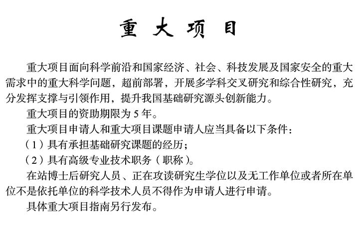 5. 在站博士后研究人員可以作為申請(qǐng)人申請(qǐng)的項(xiàng)目類型包括面上項(xiàng)目、青年科學(xué)基金項(xiàng)目、地區(qū)科學(xué)基金項(xiàng)目和部分其他類型項(xiàng)目(由相應(yīng)項(xiàng)目指南確定),但在聘(站)博士后研究人員不得通過港澳地區(qū)依托單位申請(qǐng)青年科學(xué)基金項(xiàng)目。
