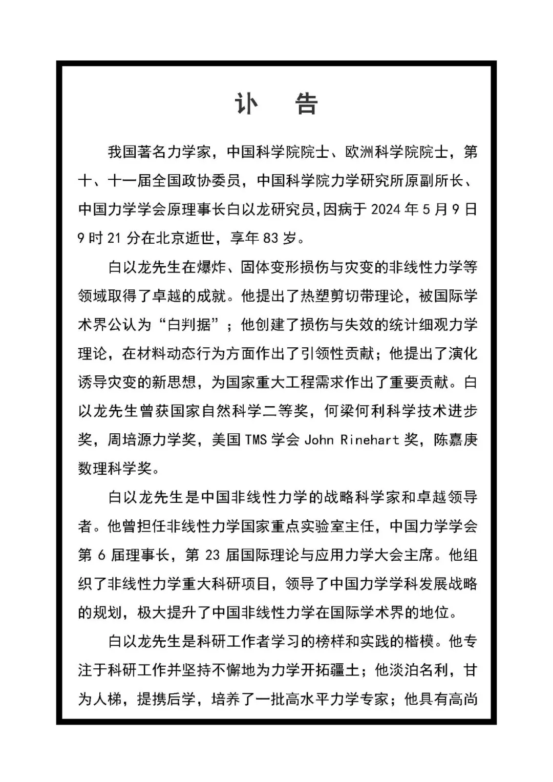 中國科學(xué)院力學(xué)所5月9日發(fā)布訃告:中國著名力學(xué)家,中國科學(xué)院院士、歐洲科學(xué)院院士,第十、十一屆全國政協(xié)委員,中國科學(xué)院力學(xué)研究所原副所長、中國力學(xué)學(xué)會原理事長白以龍研究員,因病于當(dāng)天上午在北京逝世,享年83歲。