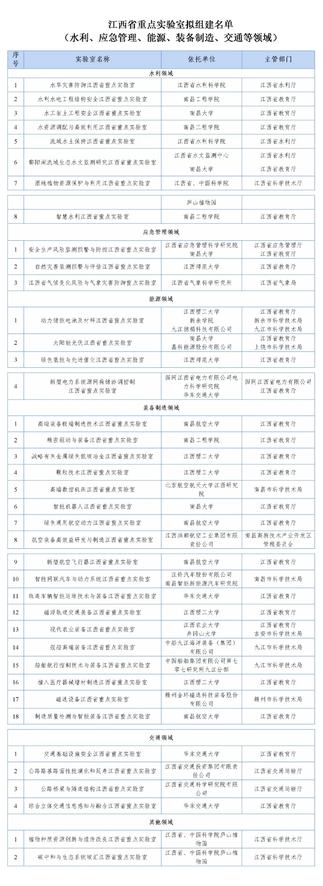 江西省科技廳日前公示,經(jīng)組織申報(bào)、形式審查、專家評(píng)審、現(xiàn)場(chǎng)考察、會(huì)議審定等程序,擬批復(fù)組建依托“水旱災(zāi)害防御江西省重點(diǎn)實(shí)驗(yàn)室”等39個(gè)江西省重點(diǎn)實(shí)驗(yàn)室。此次批復(fù)組建的實(shí)驗(yàn)室主要分布在水利、應(yīng)急管理、能源、裝備制造、交通等領(lǐng)域,大部分依托南昌大學(xué)、江西師范大學(xué)、華東交通大學(xué)、江西理工大學(xué)、南昌航空大學(xué)、井岡山大學(xué)、南昌工程學(xué)院、新余學(xué)院等省內(nèi)高校。