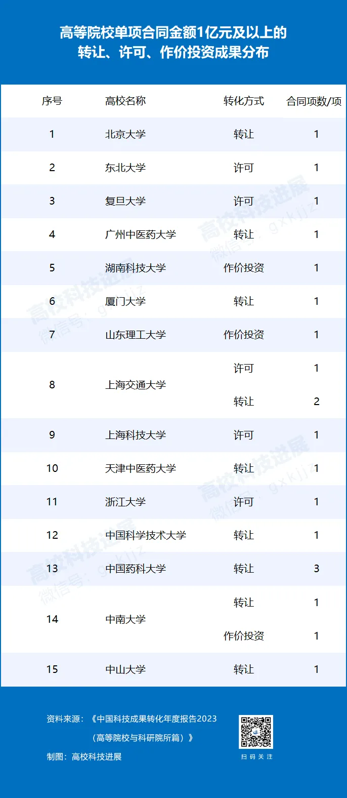15所高校20項合同,單項合同金額超1億元(以轉讓、許可、作價投資方式)