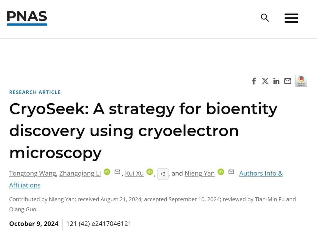 2024年10月9日,深圳醫(yī)學(xué)科學(xué)院顏寧團(tuán)隊(duì)在 PNAS 雜志(《美國(guó)國(guó)家科學(xué)院院刊》)在線發(fā)表題為 CryoSeek: A strategy for bio-entity discovery using cryo-electron microscopy(《CryoSeek:利用冷凍電鏡發(fā)現(xiàn)生物實(shí)體的研究策略》)的研究論文,研究團(tuán)隊(duì)將冷凍電鏡作為一種“發(fā)現(xiàn)”工具,拓展了人類視覺分辨率的極限,放眼大自然,發(fā)現(xiàn)完全未知的生物大分子。
