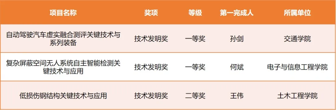 獲技術(shù)發(fā)明獎(jiǎng)3項(xiàng),其中一等獎(jiǎng)2項(xiàng),分別是交通學(xué)院孫劍主持完成的“自動(dòng)駕駛汽車(chē)虛實(shí)融合測(cè)評(píng)關(guān)鍵技術(shù)與系列裝備”、電子與信息工程學(xué)院何斌主持完成的“復(fù)雜屏蔽空間無(wú)人系統(tǒng)自主智能檢測(cè)關(guān)鍵技術(shù)與應(yīng)用”。