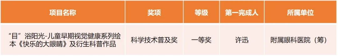 獲科學(xué)技術(shù)普及獎(jiǎng)一等獎(jiǎng)1項(xiàng),為附屬眼科醫(yī)院(籌)許迅主持完成的“‘目’浴陽(yáng)光-兒童早期視覺(jué)健康系列繪本《快樂(lè)的大眼睛》及衍生科普作品”。