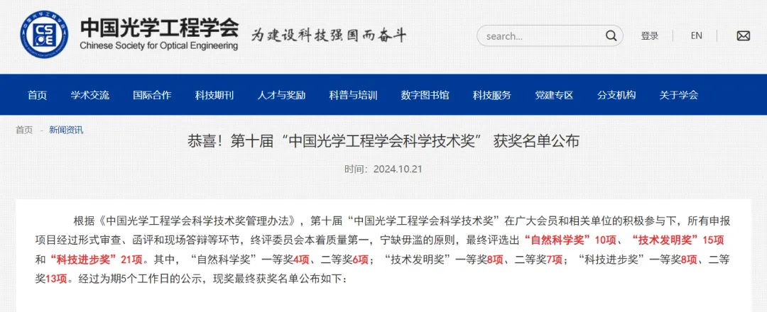 日前,2024年第十屆中國(guó)光學(xué)工程學(xué)會(huì)科學(xué)技術(shù)獎(jiǎng)獲獎(jiǎng)名單正式公布,最終評(píng)選出“自然科學(xué)獎(jiǎng)”10項(xiàng)、“技術(shù)發(fā)明獎(jiǎng)”15項(xiàng)和“科技進(jìn)步獎(jiǎng)”21項(xiàng)。其中,“自然科學(xué)獎(jiǎng)”一等獎(jiǎng)4項(xiàng)、二等獎(jiǎng)6項(xiàng);“技術(shù)發(fā)明獎(jiǎng)”一等獎(jiǎng)8項(xiàng)、二等獎(jiǎng)7項(xiàng);“科技進(jìn)步獎(jiǎng)”一等獎(jiǎng)8項(xiàng)、二等獎(jiǎng)13項(xiàng)。