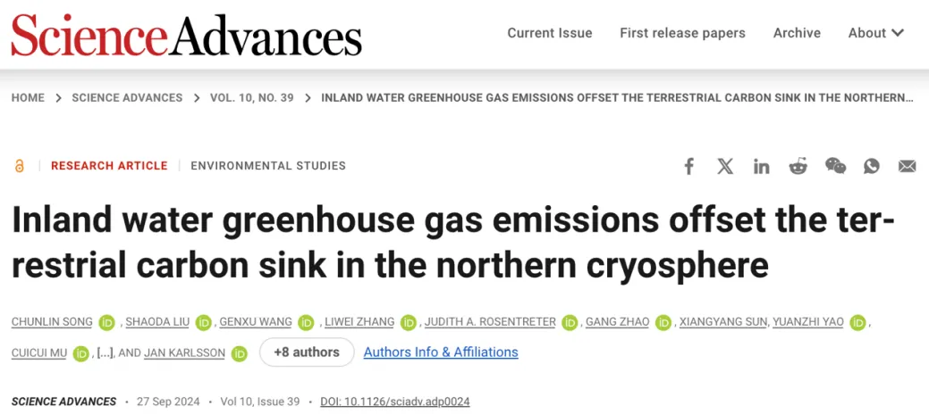 近日,四川大學(xué)水利水電學(xué)院/山區(qū)河流保護(hù)與治理全國重點(diǎn)實(shí)驗(yàn)室王根緒研究員/宋春林副研究員團(tuán)隊(duì)聯(lián)合國內(nèi)外學(xué)者在國際綜合性期刊Science Advances發(fā)表題為“Inland water greenhouse gas emissions offset the terrestrial carbon sink in the northern cryosphere”的研究論文,首次評估北半球冰凍圈內(nèi)陸水體溫室氣體排放通量和格局并探討了其對于陸地生態(tài)系統(tǒng)碳匯的抵消作用。