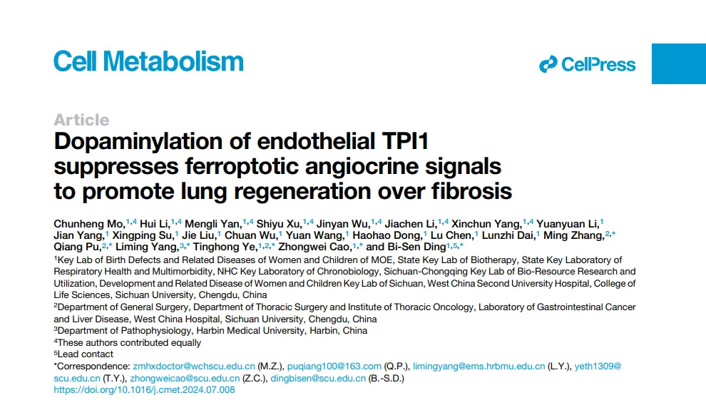 丁楅森/曹中煒團(tuán)隊(duì)聯(lián)合國內(nèi)相關(guān)領(lǐng)域科研人員在Cell Metabolism發(fā)表了題為“Dopaminylation of endothelial TPI1 suppresses ferroptotic angiocrine signals to promote lung regeneration over fibrosis”的研究論文。該研究通過整合點(diǎn)擊化學(xué)、蛋白組學(xué)、結(jié)構(gòu)生物學(xué)、基因敲除/敲入鼠、臨床分析等多學(xué)科手段,發(fā)現(xiàn)多巴胺通過修飾肺血管TPI1調(diào)控Angiocrine因子,抑制鐵死亡從而促進(jìn)肺再生并抑制纖維化。