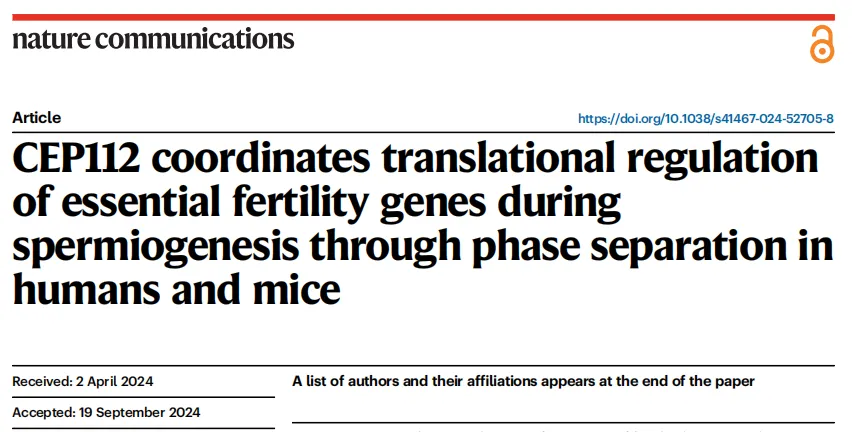 近日,華西二院生殖遺傳與表觀遺傳實(shí)驗(yàn)室許文明團(tuán)隊(duì)和中信湘雅生殖與遺傳專科醫(yī)院譚躍球團(tuán)隊(duì)合作在Nature Communications上發(fā)表了題為CEP112 Coordinates Translational Regulation of Essential Fertility Genes During Spermiogenesis Through Phase Separation in Humans and Mice的研究論文。這項(xiàng)研究揭示了中心體蛋白112(CEP112)在精子形成過程中的關(guān)鍵作用,并為男性不育的分子機(jī)制提供了新的見解。