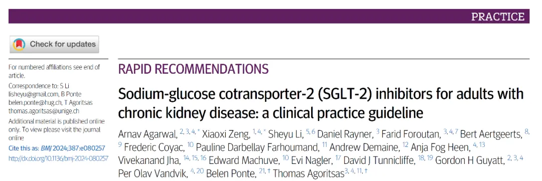 近日,四川大學(xué)華西醫(yī)院腎臟內(nèi)科/生物醫(yī)學(xué)大數(shù)據(jù)研究院曾筱茜副教授、內(nèi)分泌代謝科李舍予副教授,聯(lián)合9個(gè)國家的腎臟科、普通內(nèi)科、內(nèi)分泌科、全科醫(yī)學(xué)科等15名臨床醫(yī)生、循證醫(yī)學(xué)方法學(xué)家以及3名慢性腎病患者,共同制定的《鈉-葡萄糖共轉(zhuǎn)運(yùn)蛋白2(SGLT2)抑制劑治療成人慢性腎臟病(CKD)臨床實(shí)踐指南》,在“臨床醫(yī)學(xué)四大刊”之一的BMJ發(fā)表。