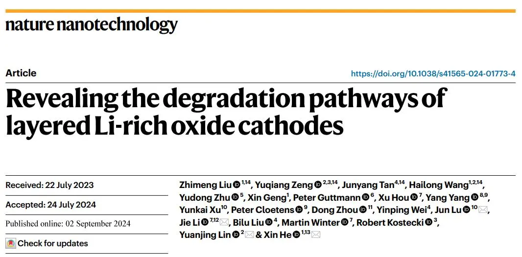 近日,四川大學(xué)化學(xué)工程學(xué)院何欣研究員團(tuán)隊(duì)在國際期刊Nature Nanotechnology上發(fā)表題為Revealing the degradation pathways of layered Li-rich oxide cathodes的研究文章。通過整合形貌、結(jié)構(gòu)和從單個(gè)原子的氧化態(tài)演化到次級顆粒的分析,經(jīng)過納米尺度到微尺度的表征,確定了與顆粒內(nèi)非相反應(yīng)相關(guān)的不同結(jié)構(gòu)變化途徑。