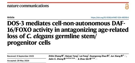 全球老齡化不斷加劇,如何延緩衰老、促進(jìn)健康衰老,需要對(duì)衰老這一生理過(guò)程進(jìn)行更深入的探索。醫(yī)學(xué)院、附屬同濟(jì)醫(yī)院秦昭、鄭加麟、相俊團(tuán)隊(duì)研究發(fā)現(xiàn)一個(gè)非經(jīng)典的Notch配體DOS-3介導(dǎo)PSG細(xì)胞中的DAF-16/FOXO活性以拮抗線蟲(chóng)生殖干細(xì)胞隨年齡的衰減,研究對(duì)于解析生殖衰老和干細(xì)胞衰老的機(jī)制具有廣泛意義。該研究成果發(fā)表于《自然·通訊》(Nature Communications)。