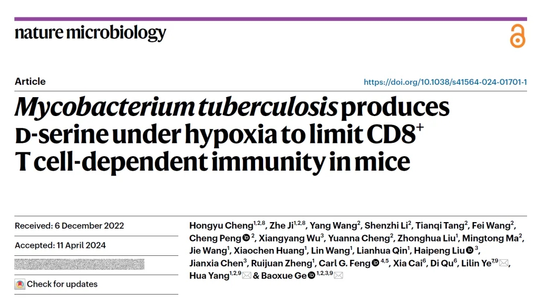 由結(jié)核分枝桿菌感染引起的結(jié)核病(Tuberculosis, TB)仍然是嚴(yán)重威脅人類(lèi)健康的重大傳染性疾病之一。醫(yī)學(xué)院戈寶學(xué)、楊華團(tuán)隊(duì)合作研究發(fā)現(xiàn)了結(jié)核桿菌逃避CD8+ T細(xì)胞免疫清除新機(jī)制,針對(duì)結(jié)核分枝桿菌關(guān)鍵代謝通路開(kāi)發(fā)抗結(jié)核藥物和疫苗提供了新的見(jiàn)解和潛在靶點(diǎn)。該研究成果在線發(fā)表于《自然·微生物學(xué)》(Nature Microbiology)。