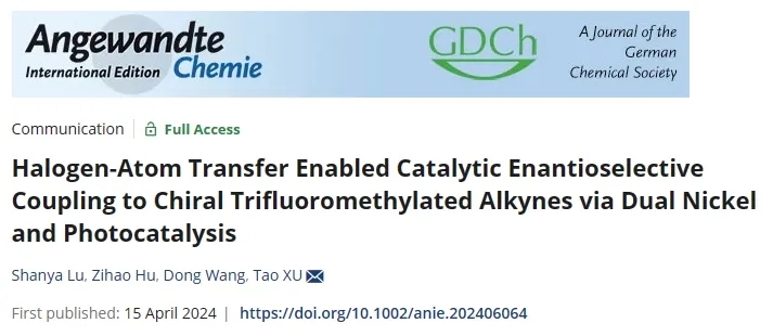手性α-CF3炔烴化是一類(lèi)非常重要的合成,在化學(xué)合成、藥物開(kāi)發(fā)等領(lǐng)域有著獨(dú)特而顯著的作用?;瘜W(xué)科學(xué)與工程學(xué)院徐濤課題組利用鹵原子轉(zhuǎn)移策略實(shí)現(xiàn)手性α-CF3炔烴高效構(gòu)建的新方法,進(jìn)一步證明了光鎳雙催化不對(duì)稱還原偶聯(lián)體系的優(yōu)勢(shì),為后續(xù)實(shí)現(xiàn)醇的不對(duì)稱去氧偶聯(lián)反應(yīng)奠定基礎(chǔ)。相關(guān)研究成果在線發(fā)表于《德國(guó)應(yīng)用化學(xué)》(Angewandte Chemie International Edition)。