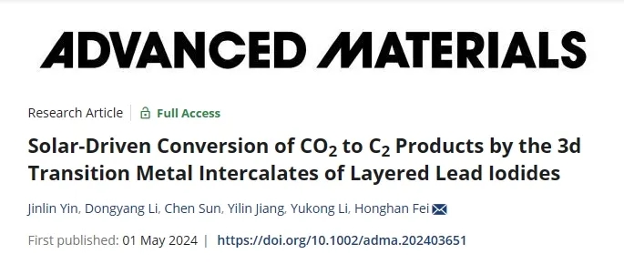 模仿自然界中的光合作用,利用人工合成的光催化劑將CO2光還原到高附加值的C2+化學(xué)品,具有重要的科學(xué)意義?;瘜W(xué)科學(xué)與工程學(xué)院費(fèi)泓涵課題組通過(guò)配位組裝策略,將具有氧化還原活性的3d過(guò)渡金屬(Co2+/Ni2+)插層至準(zhǔn)二維層狀配位型有機(jī)碘化鉛的相鄰層間,實(shí)現(xiàn)高選擇性光催化CO2得到C2產(chǎn)物。相關(guān)研究成果發(fā)表于《先進(jìn)材料》(Advanced Materials)。