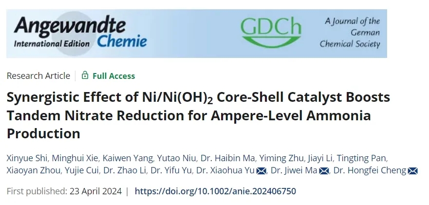 氨是重要的氮肥來(lái)源,也是清潔燃料。電催化硝酸鹽還原制氨被認(rèn)為是最有望替代哈伯法的綠色制氨技術(shù),設(shè)計(jì)高活性和高選擇性的催化劑是實(shí)現(xiàn)高效電催化硝酸鹽制氨的關(guān)鍵。材料科學(xué)與工程學(xué)院程洪飛課題組合成了具備核殼異質(zhì)結(jié)構(gòu)的Ni/Ni(OH)2催化劑,實(shí)現(xiàn)了安培級(jí)電流密度的制氨。相關(guān)研究成果發(fā)表于《德國(guó)應(yīng)用化學(xué)》(Angewandte Chemie International Edition)。