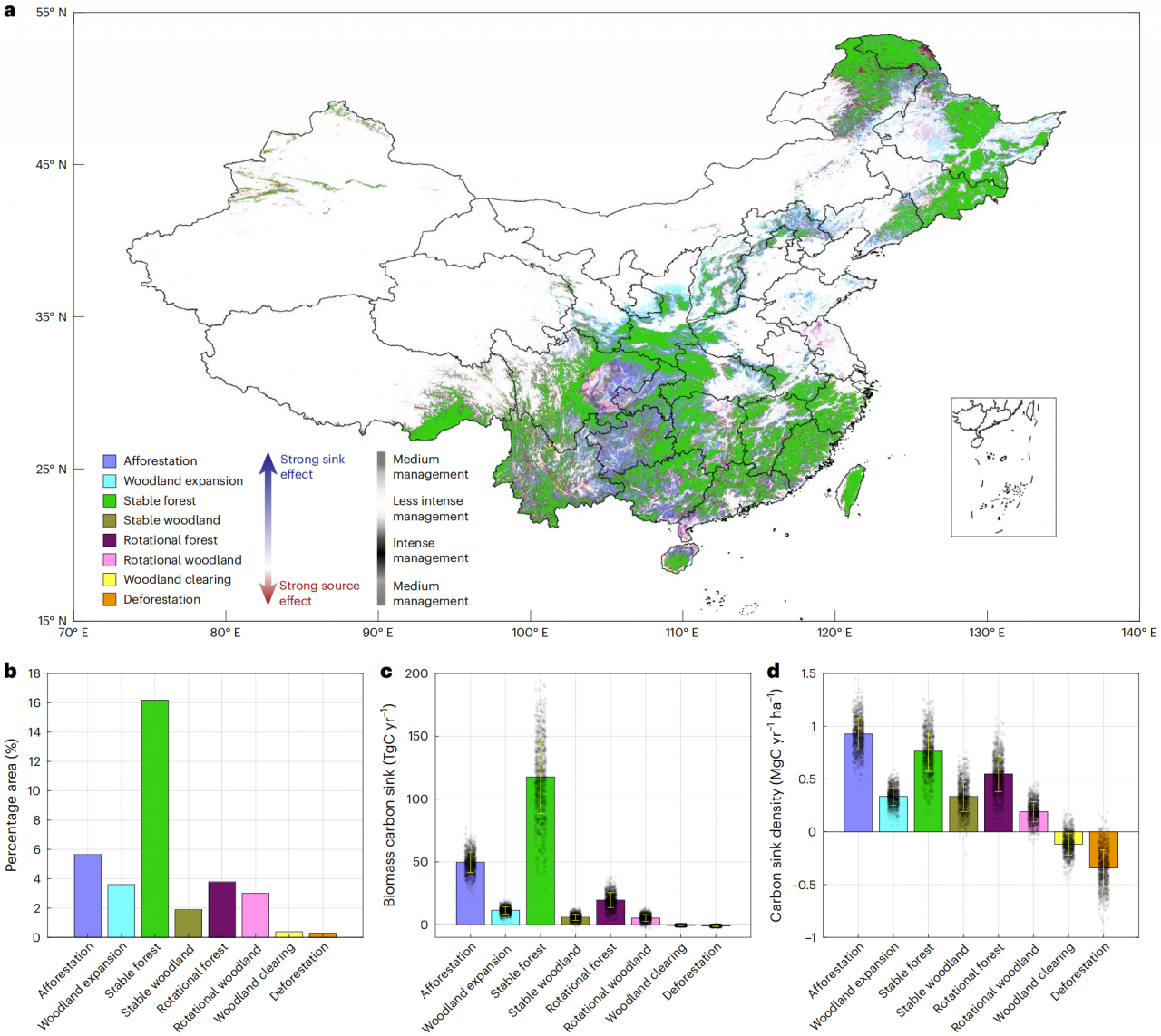 近日,電子科技大學(xué)資源與環(huán)境學(xué)院定量遙感團(tuán)隊(duì)廖展芒副教授在中國(guó)森林碳匯研究方向取得重要進(jìn)展。相關(guān)研究成果以“Growing biomass carbon stock in China driven by expansion and conservation of woody areas”為題發(fā)表在《Nature Geoscience》上,這也是電子科大首次在該期刊發(fā)表論文。
