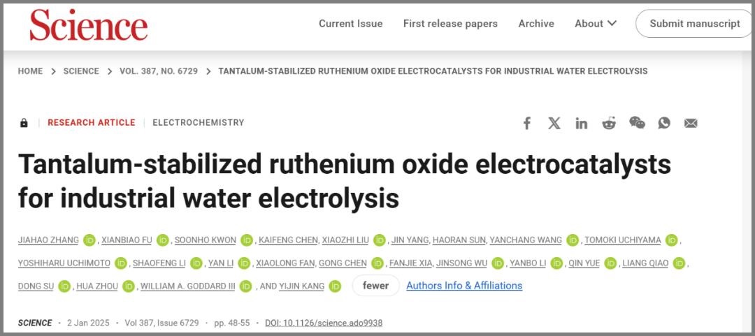 近日,四川大學(xué)化學(xué)工程學(xué)院康毅進(jìn)教授團(tuán)隊(duì)聯(lián)合加州理工學(xué)院William A. Goddard教授團(tuán)隊(duì)在《Science》發(fā)表了題為“Tantalum-stabilized ruthenium oxide electrocatalystsfor industrial water electrolysis”的文章。