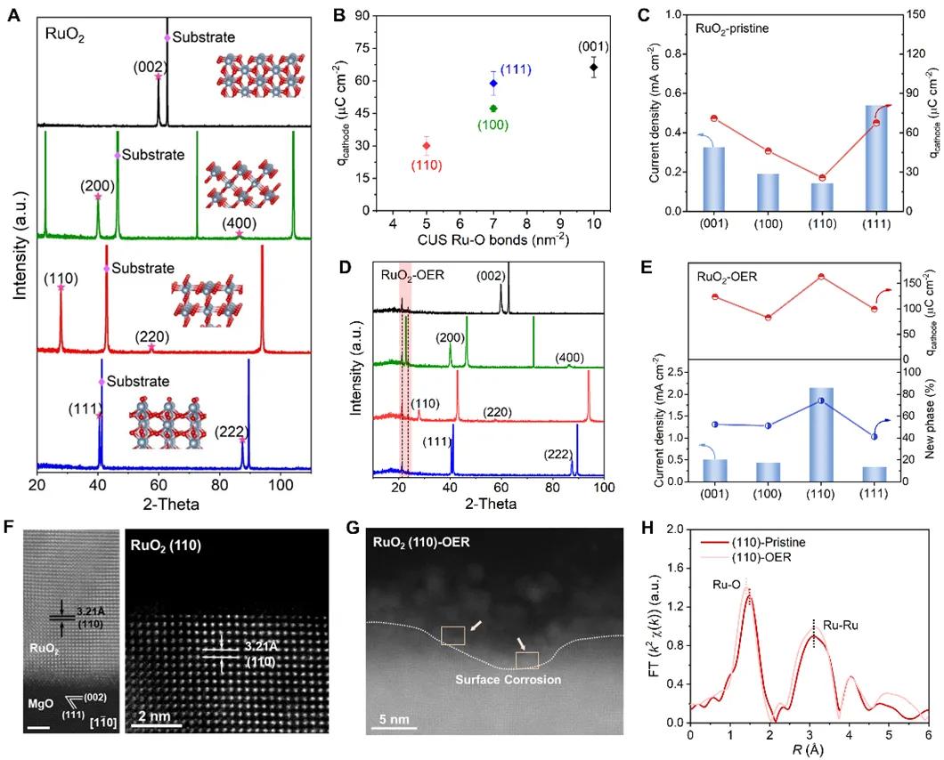 Ru基氧化物因優(yōu)異的析氧活性被視為另一類潛在的PEM電解水陽(yáng)極催化劑,然而其穩(wěn)定性相較于Ir基催化劑表現(xiàn)出明顯劣勢(shì)。理解RuO2結(jié)構(gòu)失效機(jī)制為指導(dǎo)設(shè)計(jì)高穩(wěn)定性RuO2催化劑提供了底層邏輯。當(dāng)前針對(duì)Ru基氧化物的穩(wěn)定性優(yōu)化策略已被廣泛報(bào)導(dǎo),但圍繞RuO2的結(jié)構(gòu)失效機(jī)制仍未明晰,且常用的納米顆粒催化體系中復(fù)雜的表面結(jié)構(gòu)和晶面組成給原子層面研究催化劑失效機(jī)制帶來(lái)了巨大挑戰(zhàn)。