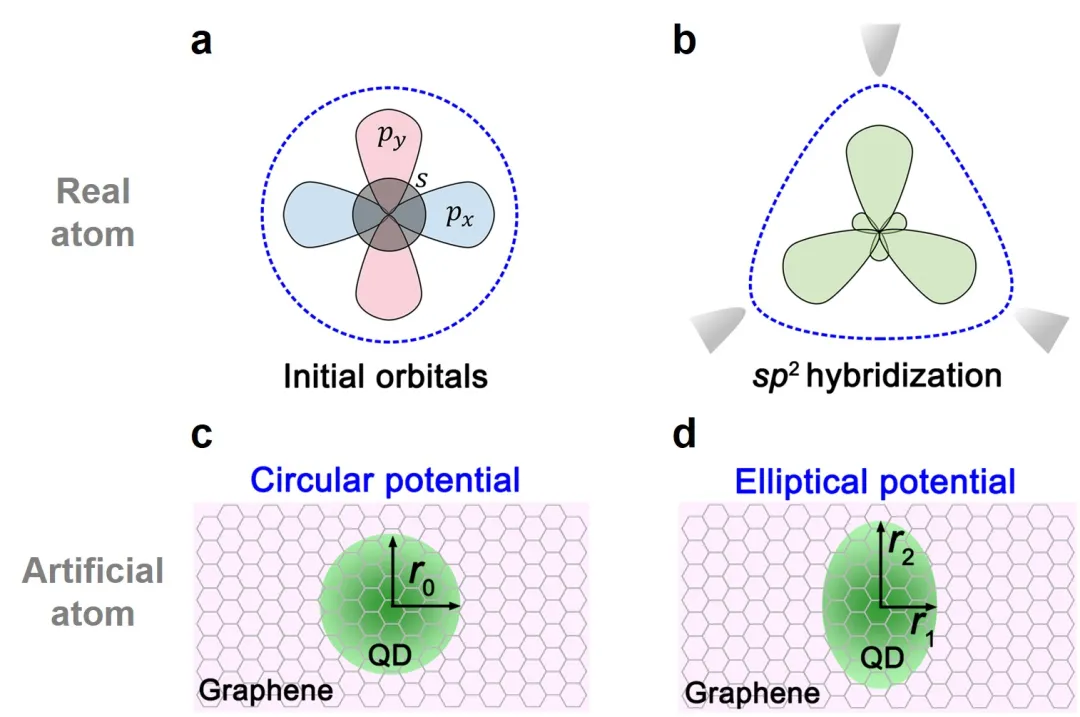 下半部分:人造原子中的(c)圓形勢(shì)場(chǎng)和(d)橢圓形勢(shì)場(chǎng)示意圖。