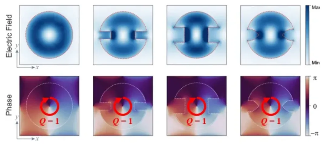 具有對結(jié)構(gòu)微擾免疫的拓撲共振模式。其電場分布在結(jié)構(gòu)中心呈現(xiàn)一個奇點,相位分布具有非平庸拓撲荷,不受結(jié)構(gòu)微擾的影響。